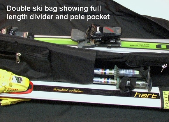 Our ski bags come in lengths to fit YOUR SKIS, no more folded over ends! Here is a double ski bag with full length and width padding, and a full length padded divider. This bag has a circumference of 34 inches. It will hold 2 pairs of alpine skis with plenty of room left over. It will hold 4 to 5 pairs xc skating skis with room for a pole tube. There is a full length padded divider that has compartments for two or more pairs of ski poles, and 2 zippered patch pockets for accessories. In between a layer of 1050 ballistic nylon and a layer of 1000 denier Cordura nylon, we place a full length and full width piece of 1/2 inch open cell foam. This combination provides perfect protection without being too heavy or unbendable. The handles are 3 inch webbing, with reinforcement straps on the stress points. There are 4 compression straps with ITW side release buckles and a large #10 full length zipper. Black. Includes padded shoulder strap.
